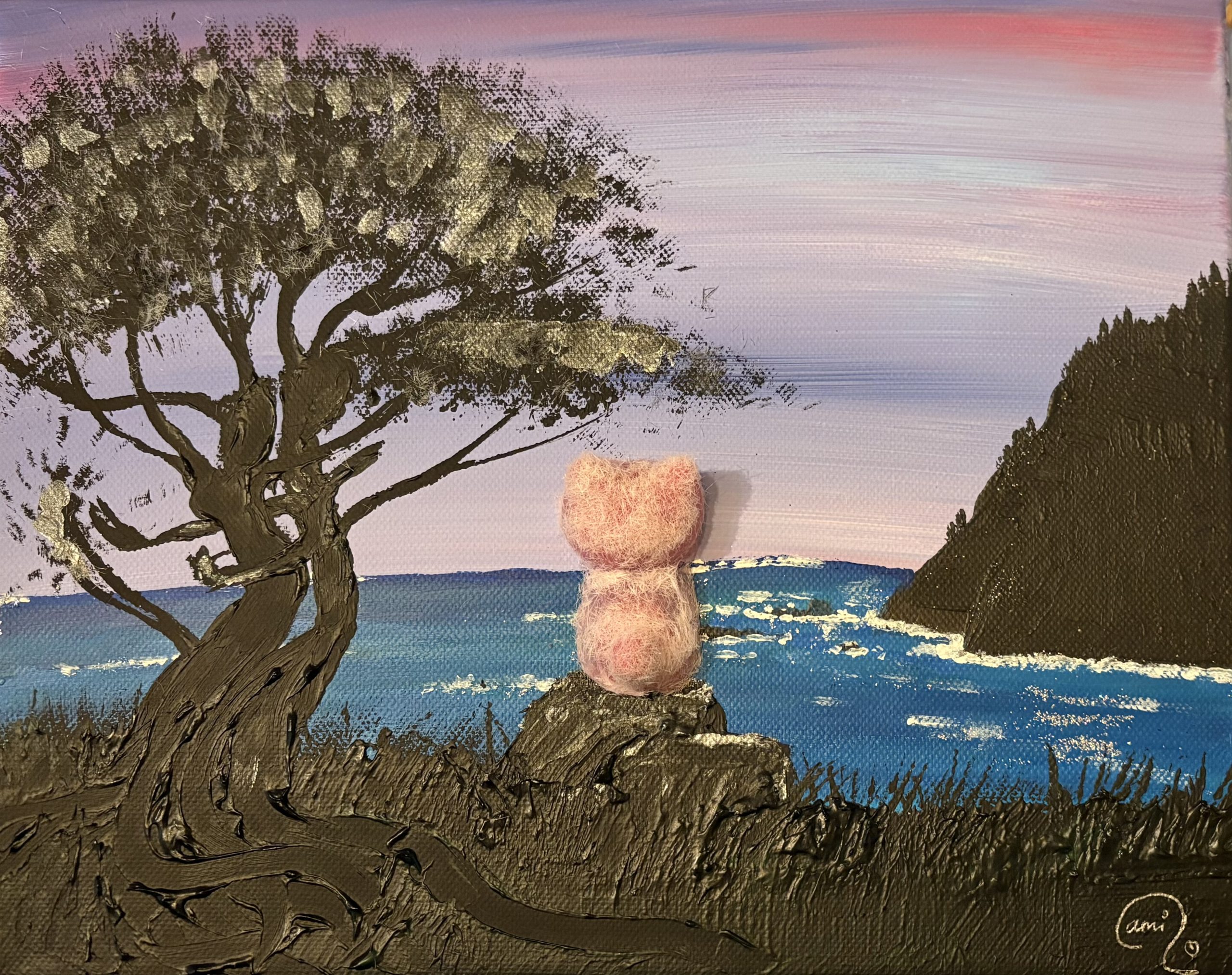 Peinture acrylique représentant un chat moelleux méditant dans un magnifique coucher de soleil